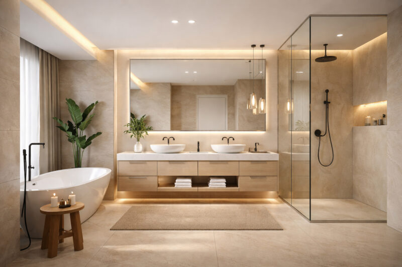 U velikim kupatilima ambijentalna rasveta dolazi posebno do izražaja. Diskretne LED trake u nišama, ispod ormarića ili oko plafona mogu stvoriti veoma prijatnu atmosferu, naročito tokom večernjih sati.
